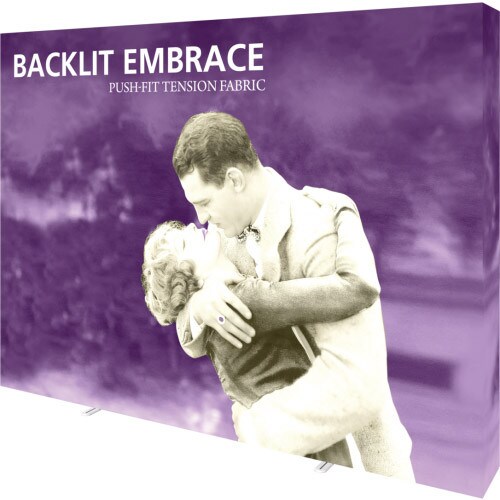 The Embrace™ 10ft full height (4 Quad x 3 Quad) backlit push-fit fabric display is a sleek illuminated collapsible display. The Backlit Embrace makes it simple to make a big impact in minutes with easy-to-attach patent-pending LED lighting and a push-fit backlit graphic that attaches to channel bars around the perimeter of the frame. Simply attach lights to the collapsible frame and insert the graphic into the channel bars for an impactful illuminated display solution! Graphics available as single or double-sided with endcaps. No tools are required for assembly. A protective molded case for storage and transport are included. Option available to purchase frame, LED lights and case only.
