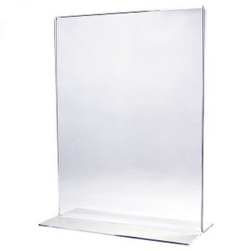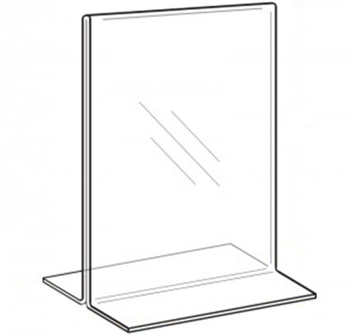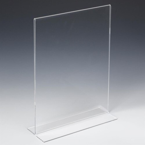 This clear counter top vertical 11" wide x 14" high sign is perfect for displaying two advertisements in one display. Featuring a t-frame style, you can easily load your 11"w x 14"h sheets from the bottom or sides. These acrylic counter top sign frames are ideal promotional advertising. Display these vertical sign frames on retail store table tops, at conventions, trade shows and lobbies. If 2-sided tabletop sign holders are what you are searching for then buy today to meet your sign frames need.