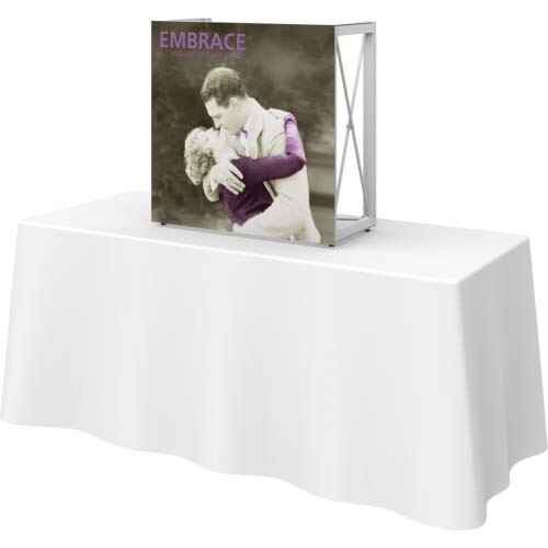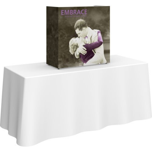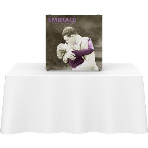 Embrace™ 2.5ft (1 Quad x 1 Quad) is a sleek, collapsible, portable tabletop display that delivers style with minimal effort. Embrace 2.5ft (1 Quad x 1 Quad) features a sleek, collapsible white frame with channel bars that hold push-fit fabric graphics offered with or without endcaps. No tools are required for assembly. The lightweight and highly portable display packs away as easily as it sets up for the ideal tabletop display.