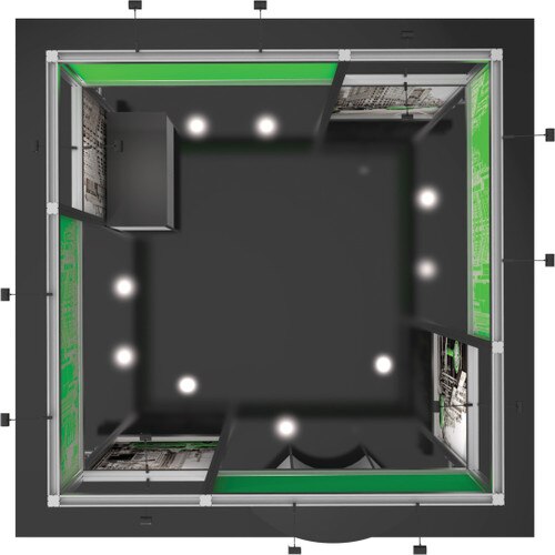 Hybrid Pro™ Modular Kit 18 is a prominent 20ft x 20ft island exhibit, perfect for the serious exhibitor. Kit 18 features a square-shaped, heavy-duty aluminum extrusion frame coupled with seamless push-fit SEG fabric graphics. The structure, standing 11' 10" tall and topped with LED display lights, provides easy-to-see messaging across the show floor. A counter with locking storage and literature racks provide functionality and room to display literature and sales pieces.