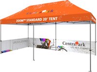 The Zoom™ Standard 20ft Popup tent is an ideal weather-resistant display for use at outdoor exhibitions, sporting events, concerts and more. The rust-resistant aluminum frame is lightweight and stable, and vibrant stock and custom printed canopies are designed to withstand the elements.