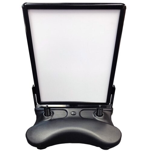 Affordable yet durable these sidewalk displays are perfect for restaurants, retail stores or salons to promote their upcoming sales or events outside their facility. To set up, simply slide your posters underneath the non-glare lenses and snap the molding shut. Built-in handles and wheels making re positioning easier are included. Marketing doesn’t stop in windy weather! These outdoor signs stand still with their water-fill base in uncontrollable weather conditions. They have spring shocks located on the bottom of each frame allowing the sidewalk pavement signs to sway with heavy winds, while the water base keeps them in place. These pavement signs have no sharp edges for safety in public open areas, suitable for use in crowd, has steel springs for flexibility in wind. The spring connectors stabilize the position of your poster. Poster use is double sided. Ground wheels in upside position enable easy movement of the product.