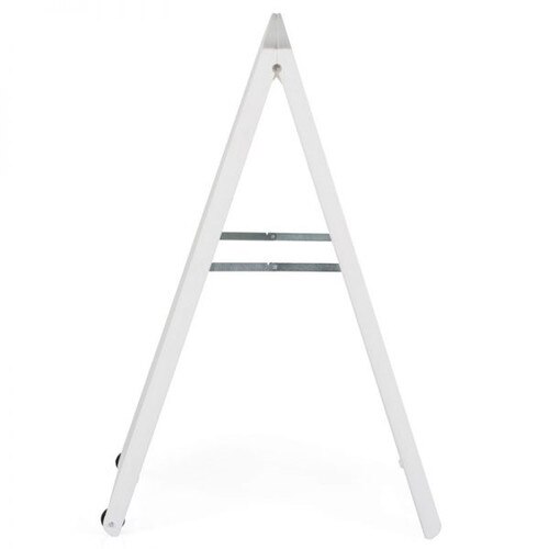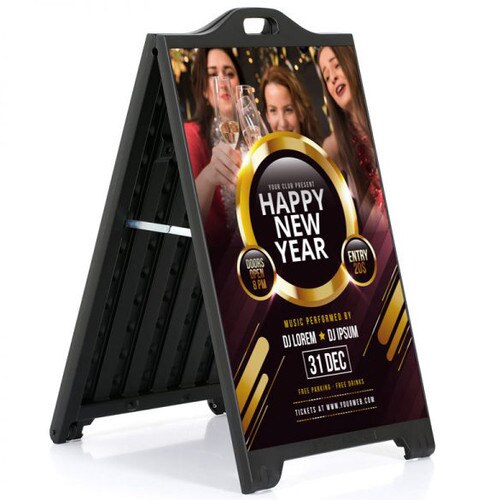 This A-Frame outdoor sidewalk sign is super heavy duty and is made for laminating self-adhesive sticker. Prints applied by vinyl sheeting, by use of well nuts, by metal or plastic signs. Holds (2) 24" x 36"h signs in place. No tool assembly. Features carrying handle and wheels for easy transport. Its folding design helps to save space when stored away. Advertise your promotions clearly with this weatherproof sign stand. You can simply set up the sign in seconds. No need to fill up with water or sand as it is already constructed with heavy materials.