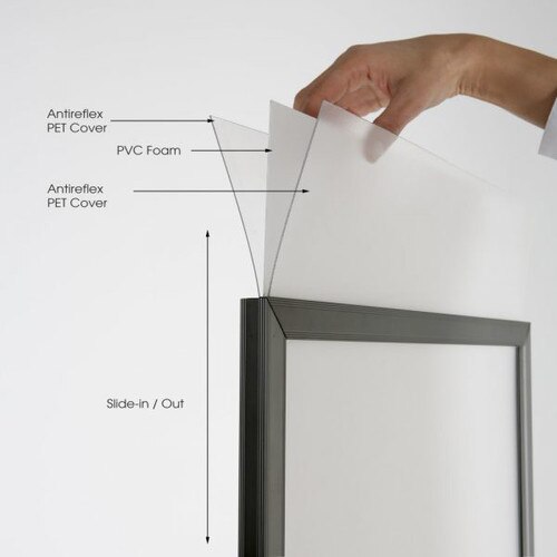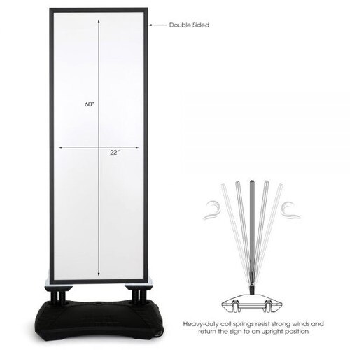 This outdoor sidewalk sign features a top loading slide in frame with (2) anti-glare pet covers, a plastic middle support and 1 Allen wrench. Poster is secured in the lockable frame and stands firm between the cover and backing. The protective PET covers feature a weather resistant film that will protect your sign from dust, mild wind, rain and snow damage. The sturdy water base provides stability and will stand up when others will fall down. This outdoor weatherproof pavement sign includes (2) heavy duty springs on each side that prevents the sign stand unit from tipping over. There are no sharp edges and is extremely flexible. The spring connectors will stabilize the position of your poster. Suitable for windy, snowy and rainy outdoor conditions. Save corners guarantee maximum safety on the pavement. Single packed with an easy assembly instruction sheet. This outdoor sidewalk sign is perfect for mild weather conditions for usage outside of restaurants, retail stores, conventions, theaters and night clubs.