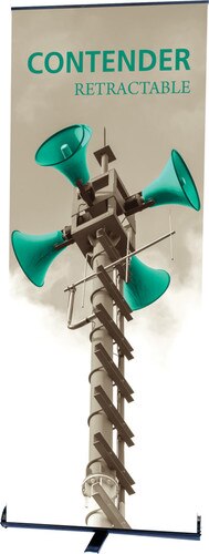 The Contender Standard retractable banner stand is a durable option for your display needs. This display system is highly portable and features a sleek design with a swivel foot base for stability. Also Available in Black (CN-30-B AX). The base measures 30.5" in width with a height range of 77.5"-105", and the banner stand comes with a carry bag. This stand is made in the USA.