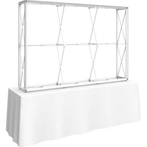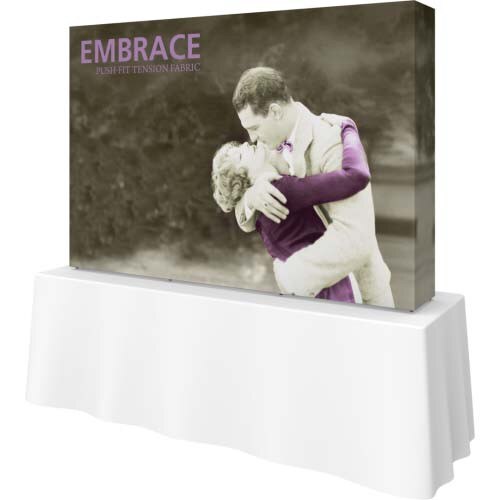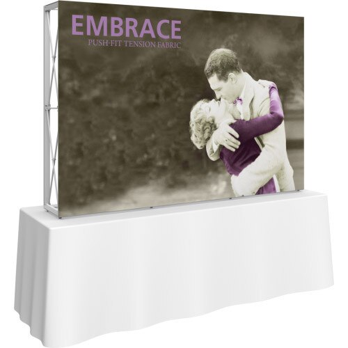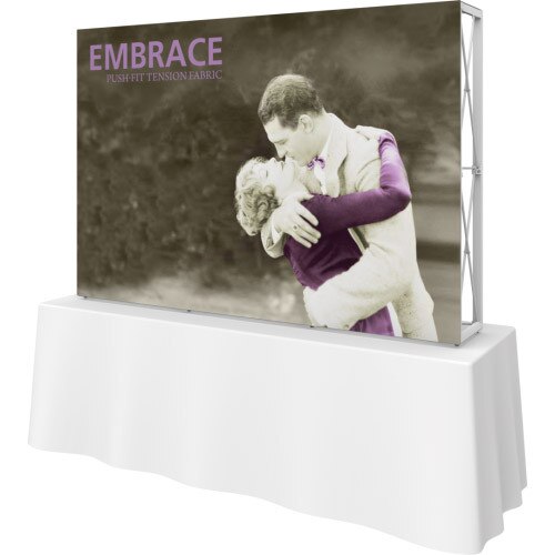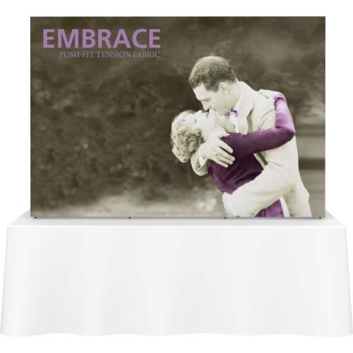 Embrace™ 7.5ft tabletop (3 Quad x 2 Quad) is a sleek, collapsible, tabletop portable display that delivers style with minimal effort. Embrace 7.5ft tabletop (3 Quad x 2 Quad) features a sleek, collapsible white frame with channel bars that hold push-fit fabric graphics offered with or without endcaps. No tools are required for assembly. The lightweight and highly portable display packs away as easily as it sets up for the ideal tradeshow, event or retail display!7.
