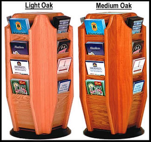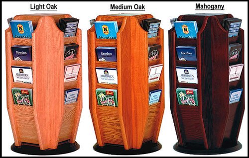 These beautiful revolving countertop wood brochure holders feature 16 pockets and are made of solid construction. These turn-style brochure displays hold up to sixteen 4" wide literature. These spinning wood brochure holders display perfectly in medical offices, law firms, dentist offices and professional office lobbies. Putting your brochures in revolving brochure displays or brochure carousel displays, saves you counter or tabletop space for actual business while providing people multiple views at your literature from many angles. Ideal for conveniently displaying many of your brochures with style. These wooden brochure holders are available in light oak, medium oak & mahogany. If these 4 tier, 16 pocket spinning wood brochure racks are what you are looking for, buy them today to meet your brochure holder displays need.