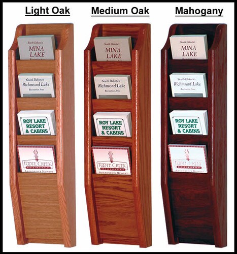 These beautiful 4 pocket wall brochure holders, sometimes popularly referred to as wall brochure racks, are constructed with solid oak sides for durability while maintaining a professional appearance. These quality brochure rack displays are perfect for medical offices and law firms. These wooden brochure racks are designed to save space while portraying a professional atmosphere. These quality wood hanging brochure holders are an ideal and unique way to display your brochures. These quality wood brochure racks will add warmth and professionalism to any lobby, room or office. These quality wood hanging brochure holders are available in light oak, medium oak or mahogany.