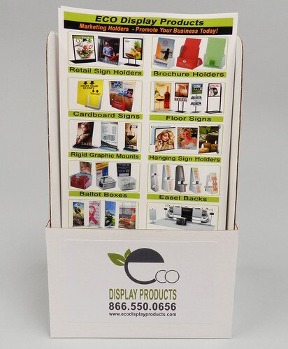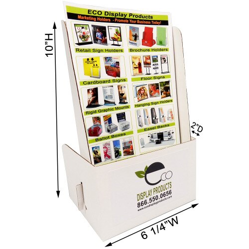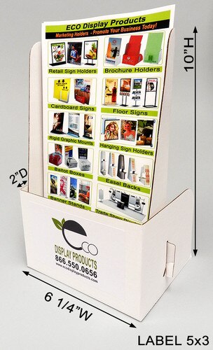 This cheap digest holder includes a front lip printed label and accommodates up to 6 1/4" wide tall brochures, digests and literature. Featuring a bright white, eye-catching tall and sturdy anti-tip design, this cheap brochure holder will not fall over. Economically shipped flat to save you money, this low cost tri-fold holder packs a maximum quantity of 100 brochure holders in one carton. Lock in tabs make assembly quick and easy. This cardboard display is produced, stocked and shipped from our Altamonte Springs, Florida warehouse.