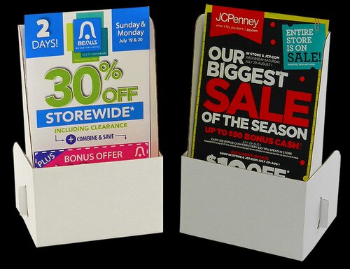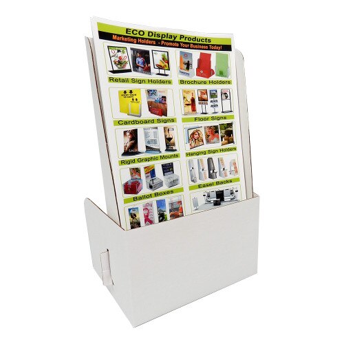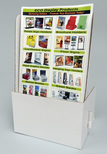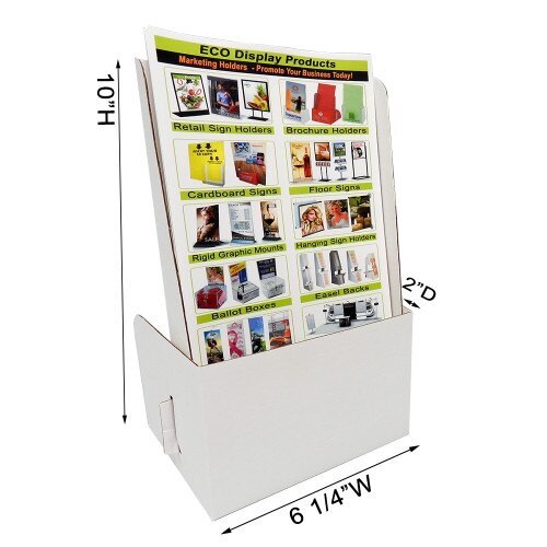 This digest size brochure holder accommodates up to 6 1/4" wide tall brochures, digests and literature. Featuring a bright white, eye-catching tall and sturdy anti-tip design, this cheap brochure holder will not fall over. Economically shipped flat to save you money, this low cost tri-fold holder packs a maximum quantity of 100 brochure holders in one carton. Lock in tabs make assembly quick and easy. This cardboard display is produced, stocked and shipped from our Altamonte Springs, Florida warehouse.