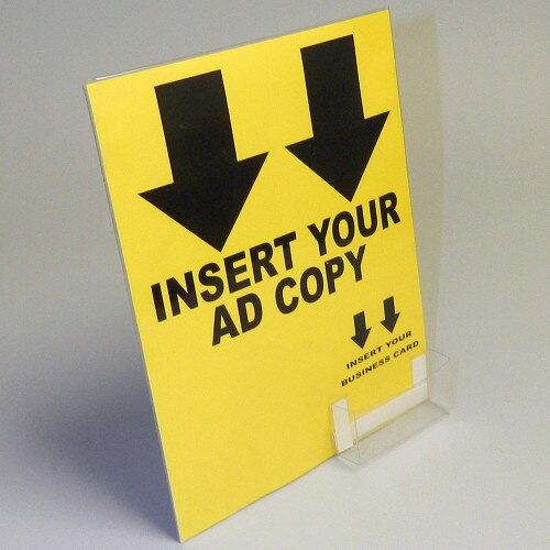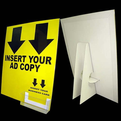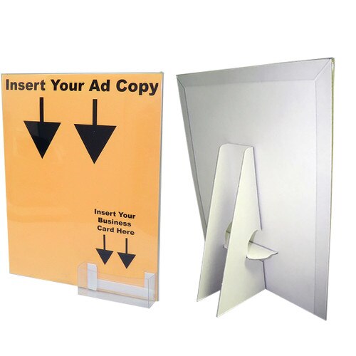 These 8 1/2" x 11" white cardboard easel displays include a clear slip-on display cover and a business card pocket. Just insert your changeable ad in these sturdy but cheap cardboard easels. These 8 1/2" x 11" cardboard signs include a clear view slip-on cover. These display easels, sometimes referred to as literature display stands, feature our sturdy angled anti-tip design and are produced from sturdy 42 point chipboard. As you may guess, these cheap cardboard displays will not fall over. Display these cardboard easel displays horizontally or vertically, whatever works for your sign display needs. Due to its high sales volume, we stock 1000s of these cardboard display stands in inventory on premises at all times at our Altamonte Springs, Florida warehouse. These popular 8 1/2" x 11" cardboard displays are priced at an unbeatable low cost and will effectively display your graphics on any retail countertop. If these cardboard easels, sometimes referred to as cardboard signs, are what you are looking for, buy them today to meet your literature display stands need.