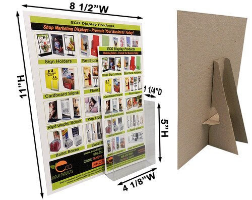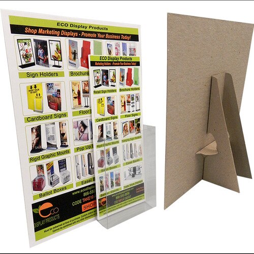 These 8 1/2" x 11" kraft cardboard easel displays include one 4" wide x 5" high clear brochure pocket or as some call it small plastic brochure holders. These cardboard signs, sometimes referred to as literature display stands, feature 1 imprinted label, our sturdy angled anti-tip design, and are produced from sturdy 42 point chipboard. As you may guess from the 42 point chipboard, these cheap cardboard displays will not tip over. Display these cardboard easel displays horizontally or vertically, whatever works for your sign display needs. Due to its high sales volume, we stock 1000s of these cardboard display stands in inventory on premises at all times at our Altamonte Springs, Florida warehouse. These popular 8 1/2" x 11" cardboard displays are priced at an unbeatable low cost and will effectively display your graphics on any retail counter. If these cardboard easels, sometimes referred to as cardboard signs, are what you are looking for, buy them now to meet your literature display stands need.