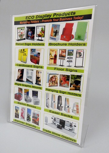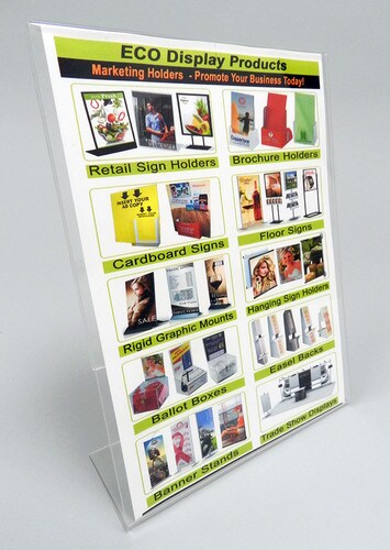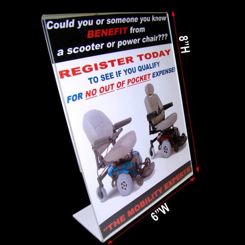 This plastic table tent displays 6" wide x 8" high graphics and features a slanted back style so your ad displays clearly with an optimal view. Easily insert your ad from the either side. Perfect size for displaying ads at the point of purchase where counter space is limited. This angled table tent offers lots of uses such as point of purchase ad holders in retail stores, lobbies, waiting rooms, hotels, doctors offices and restaurants.
