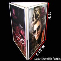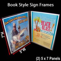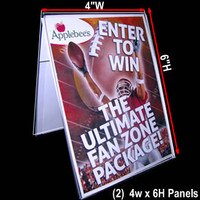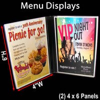 Two Panel Acrylic Menu Holders/Frames. Two panel book style acrylic sign frames display two promotional ads side by side. Use these menu frames to catch the attention of any potential customer and encourage future business with multiple promotions. Advertise current sales while promoting future events. You may only have one chance to reach that customer so communicate as much information with your eye catching graphic designs. These two-sided table menu holders will work well in most places especially restaurants and retail stores.