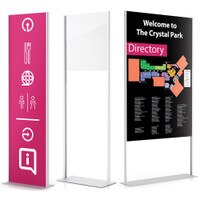 • Directories, Menu Stands. Our floor standing directories are perfect for malls, public lobbies, retail and trade shows as well as large buildings with several businesses and theme parks. These directories can also be used as menu stands which are great for customers waiting to be seated at restaurants. Styles include straight and curved uprights, straight and curved backs, single and double poles as well as square, round and oval steel bases. Features include the following: