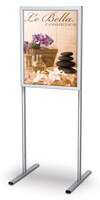 Poster Display Stands. These poster size sign holders are produced from metal with aluminum frames and are built to last. Single and double sided poster sign stands are available. The most popular poster frame sizes are 22" x 28" and 24" x 36" free standing sign frames. Poster Display Stand Features Include: