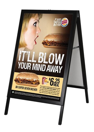 This 24”w x 36”h Slide-In A-Frame is one of the best cost effective solutions to advertise your business. Featuring a user friendly design that lets you quickly change your prints by simply sliding them in through the top. Easily fold in for storage and fold out when in use. Great for uses in restaurants, clubs, boutiques, salons, hotels and more.