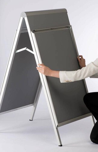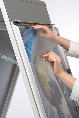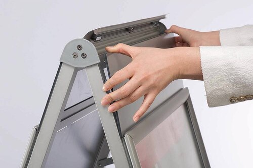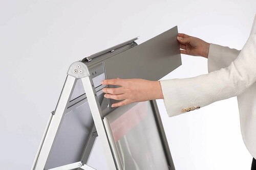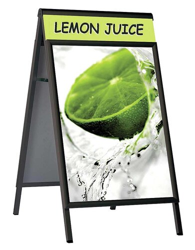 This 22”w x 28”h Slide-In A-Frame with changeable header is one of the best cost effective solutions to advertise your business. Featuring a user friendly design that lets you quickly change your prints by simply sliding them in through the top. Easily fold in for storage and fold out when in use. Great for uses in restaurants, clubs, boutiques, salons, hotels and more.