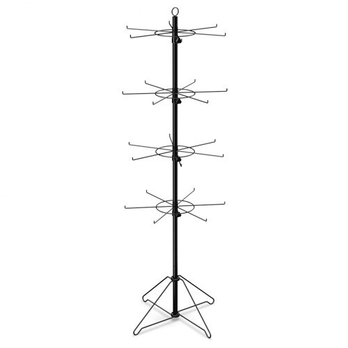 This great compact display wire spinner rack gives your merchandise great presentation! With hub-and-spoke tiers, this spinner display will hold a wide variety of merchandise. These spinner racks are most definitely the right choice when floor space is a concern. Its four tiers spin individually to give your customers the ability to browse through your merchandise with ease. These tall floor display stands have round tiers and give your products a sharper appearance. These spinning stands, or spinning display stands, ship knocked down to save you money. Hooks are 6-1/4" long. Hub-and-spoke design has 10-1/2" of hanging space between hooks, at the widest point. Bright zinc finish. Includes sign holder. Dimensions: 64"H x 18" Spinning Diameter.