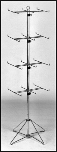 Bright zinc finish. Includes sign holder. Each tier features 6" long hooks for items up to 7-1/2" wide. Dimensions: 64"H x 20-1/2" Spinning Diameter.