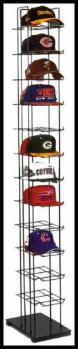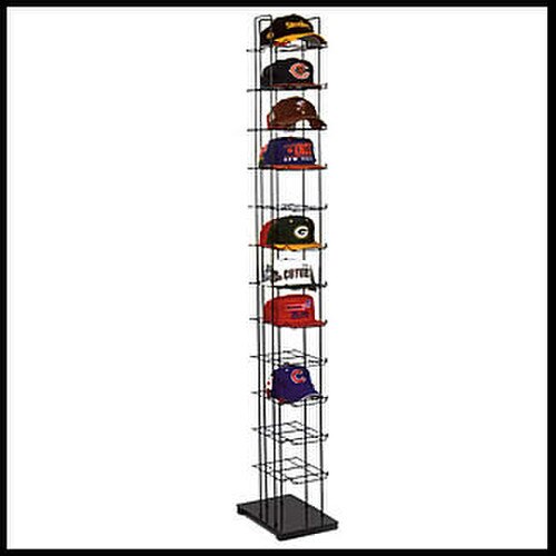 These floor baseball hat towers, sometimes referred popularly as baseball cap towers, are a must have if you have a limited amount of floor space. These tall hat towers amazingly hold 144 Caps, 12 hats per shelf. Customers can easily see the logos they're looking for with these tall hat racks for baseball caps. With 12 shelves, spaced 5-1/2" apart, this baseball cap tower will hold up to 144 caps. The weighted base prevents these floor baseball cap racks from tipping over. These baseball hat stands are a must-have when style is essential and space is tight. Black finish. Dimensions: 78"h x 10"w x 15-1/2"d
