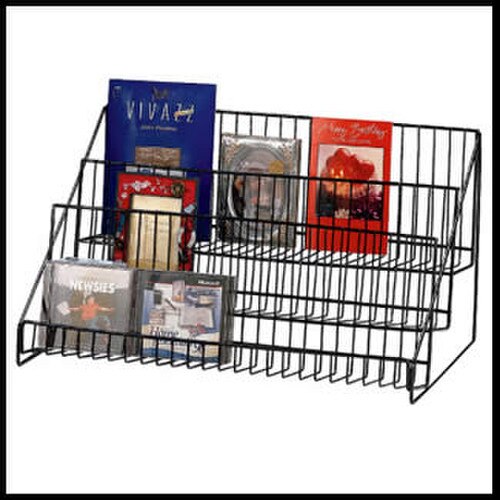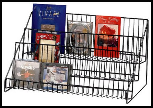 These countertop wire literature racks feature three open shelves that enable customers to clearly see literature and books. These wire displays are easy and fast assembly. These wire literature holders or racks are perfect for increasing impulse sales at checkout counters, seminars and trade shows. These metal literature stands have a black powder-coat finish.
