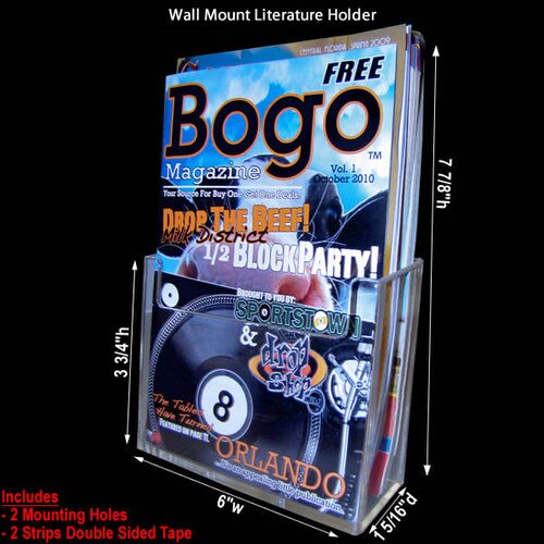 Fits material up 5 3/4'w Inside Dimensions: 6'w x 1 5/16'd Overall Dimensions: 6 1/4'w x 8'h x 1 1/2'd Pocket Capacity: Approx. 75 Brochures Double-Sided Tape Included Mounting Holes: Yes No Assembly Required Material: Clear Ridged Styrene (Acrylic) Material Thickness: .100" Optional logo imprint available on this brochure holder