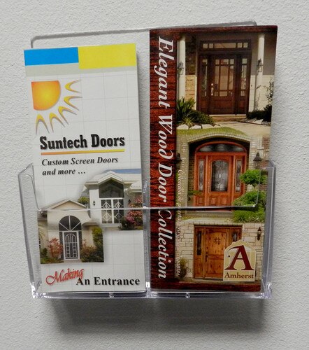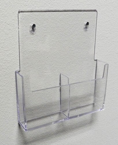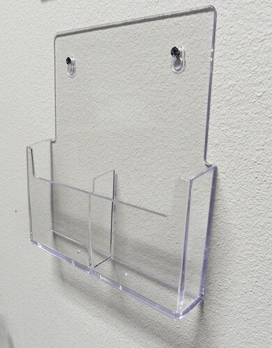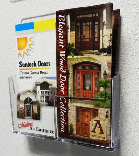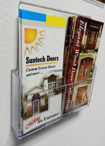 Wall Mount acrylic brochure holder with 2 side-by-side pockets for brochures. Includes (2) strips of double-sided tape as well as two key holes for wall mount. This literature holder can be used in retail stores, restaurants, convenience stores and any place you want to display literature. Acrylic brochure holders are durable and cost effective. Optional logo imprint available on this brochure holder.