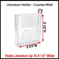 Wall mount brochure holders or wall magazine displays will easily mount to any wall and are commonly used as literature organizers to clean up the messy stacks of brochures, pamphlets and magazines scattered on desk and table tops in offices, lobbies and waiting rooms. Most of these wall mount literature holders, also sometimes referred to as wall mount literature displays and wall literature holders, can also be displayed on counters or tabletops as they have 2 key holes for wall-mounting. Acrylic brochure displays, also called plastic brochure holders, are a great way to present a clear view of the first page of your literature so people easily find the magazine they are looking for. Wall mount brochure holders or wall mount magazine holders are available in lots of sizes and styles to meet most needs of our customers. Some of these wall mounted brochure holders come with two strips of self stick adhesive tape or pre-drilled holes so hanging them on the wall is quick and easy.