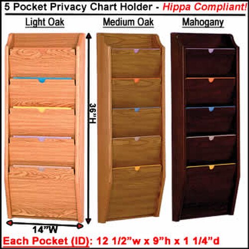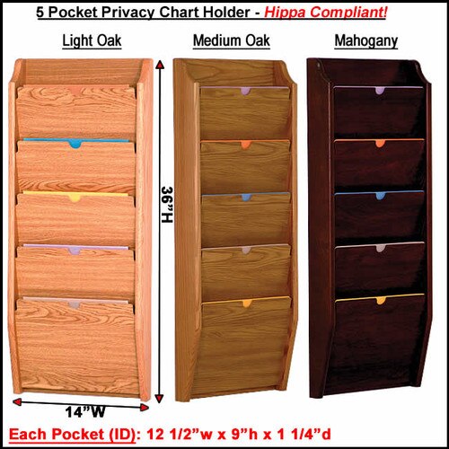 These five pocket wall mountable HIPPA-compliant patient chart holders hold patient charts up to 12 1/2" wide and 1 1/4" deep. These 5 pocket wall chart racks, sometimes referred to as medical patient file holders, feature tall 9" high front panels. These quality medical chart holders provide easy access to patients files while providing necessary privacy. These attractive wood chart holders/racks are constructed with a 3/4" solid oak bottom mounting plate, and will add warmth and professionalism to any office or room while keeping patient's records handy. These patient office racks are ideal for standard file and chart sizes, and are available in light oak, medium oak or mahogany. If these patient chart holders or patient file holders are what you are searching for, buy them now to meet your HIPPA-compliant medical displays need.